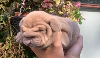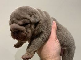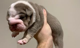 Perfect structure, single nose fold, minimal white fully suited lilac and tan female secured at days old by our client that wanted to start with the best... and he sure got that!