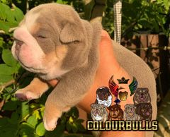 Penelope & Nemesis son. This boy is our second TRUE MINI BULLDOG produced. He’s half the size of his siblings but lacks nothing. Perfect single rope, straight legs and in lilac tri!!!